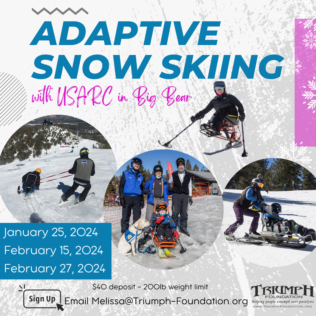 Who wants to go snow skiing with Triumph Foundation in Big Bear with United States Adaptive Recreation Center? Email melissa@triumph-foundation.org for more information and to sign up. $40 deposit. 200lb weight limit.